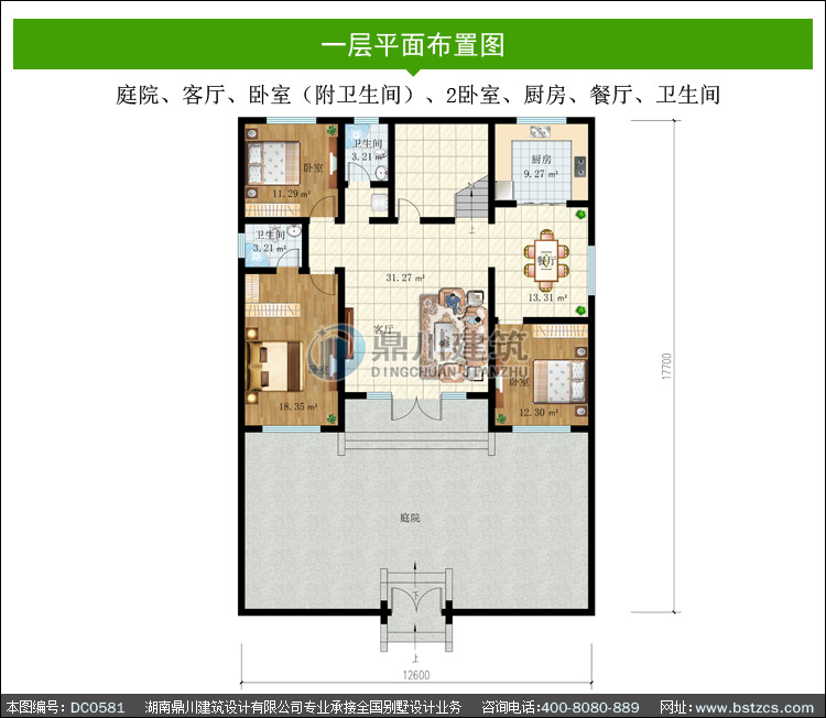 | 一 層: | 庭院、客廳、臥室(附衛(wèi)生間)、2臥室、廚房、餐廳、衛(wèi)生間 | |||