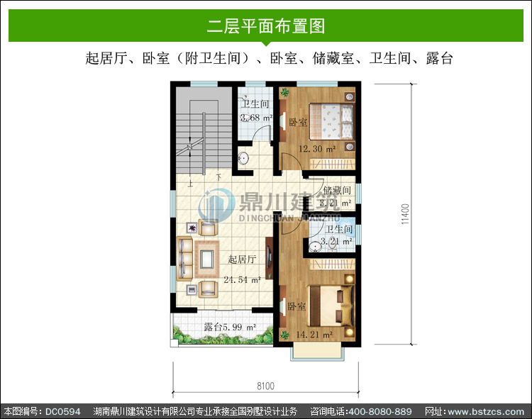 | 二 層: | 起居廳、臥室(附衛生間)、臥室、儲藏室、衛生間、露臺 | |||