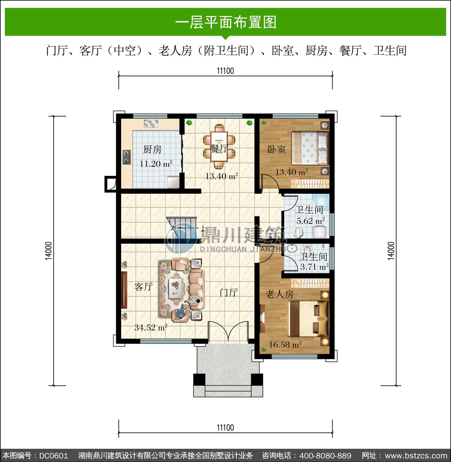 | 一 層: | 門廳、客廳(中空)、老人房(附衛生間)、臥室、廚房、餐廳、衛生間 | |||