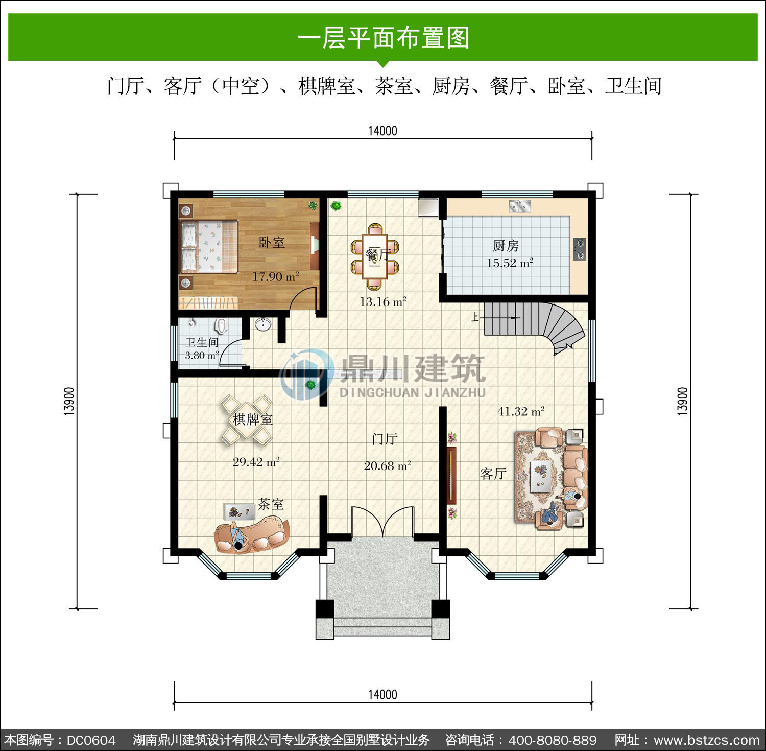 | 一 層: | 門廳、客廳(中空)、棋牌室、茶室、廚房、餐廳、臥室、衛生間 | |||