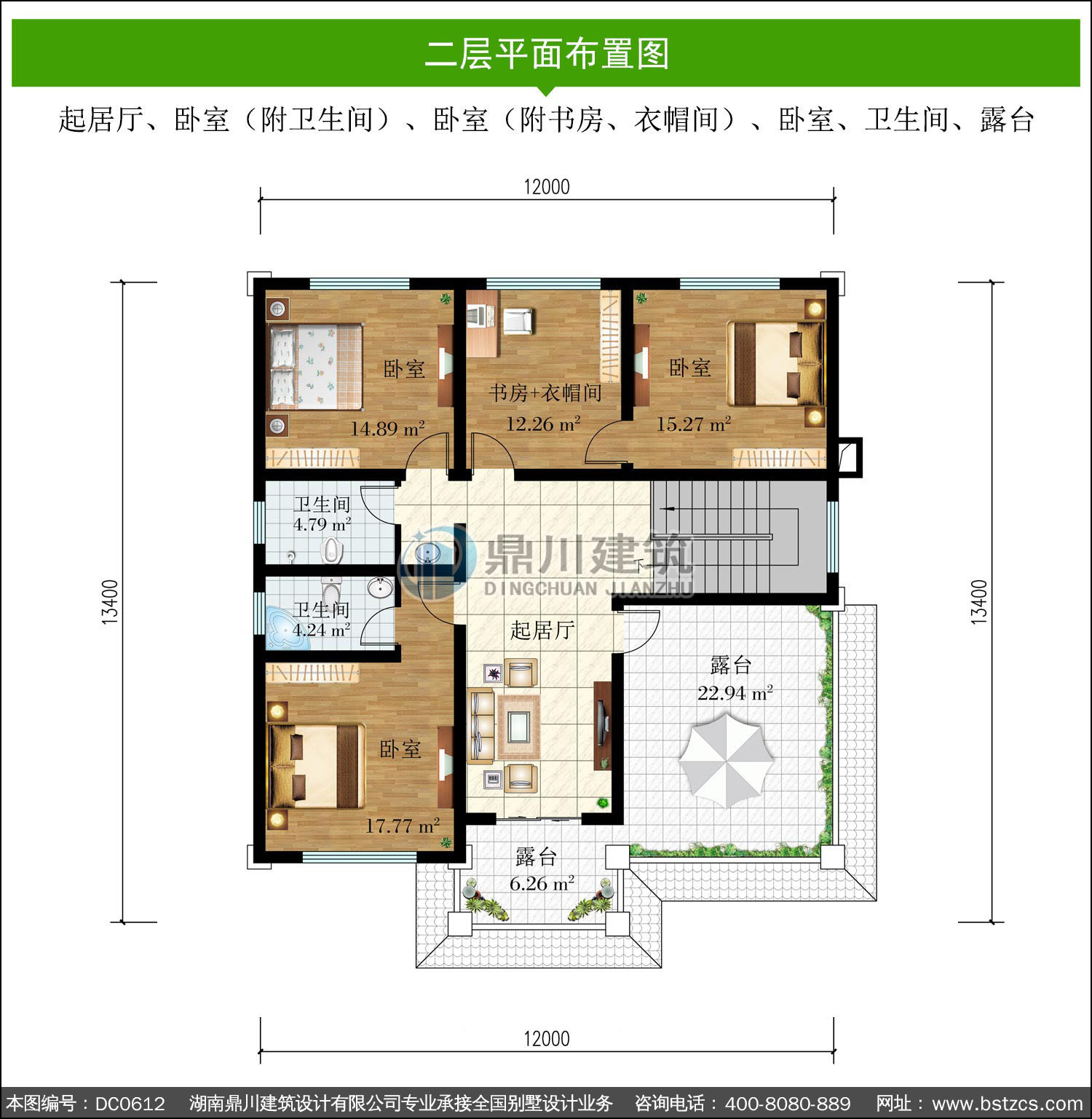 | 二 層: | 起居廳、臥室(附衛生間)、臥室(附書房、衣帽間)、臥室、衛生間、露臺 | |||