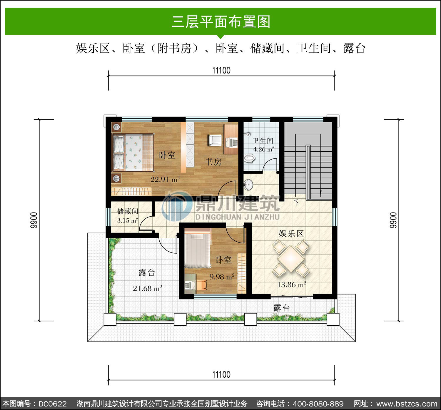 | 三 層: | 娛樂區、臥室(附書房)、臥室、儲藏間、衛生間、露臺 | |||