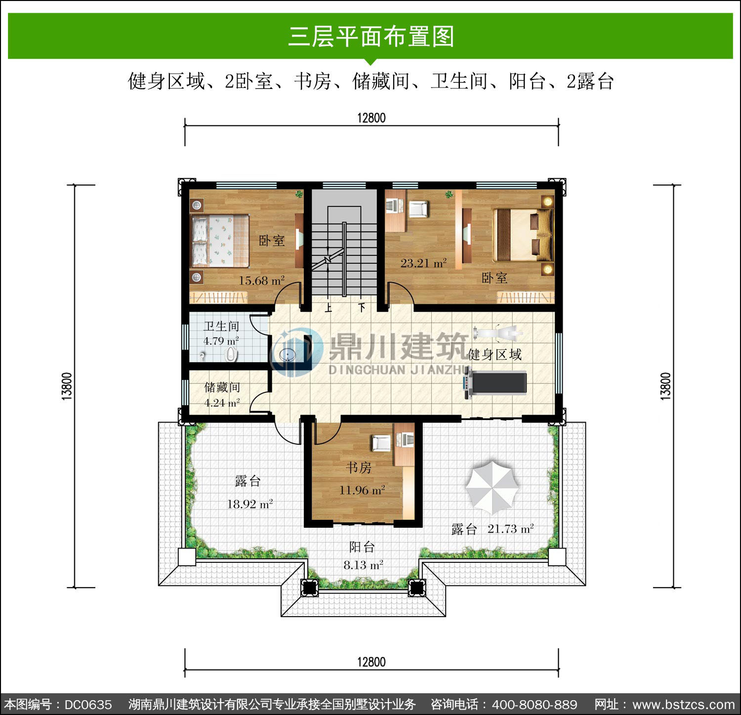 | 三 層: | 健身區域、2臥室、書房、儲藏間、衛生間、陽臺、2露臺 | |||
