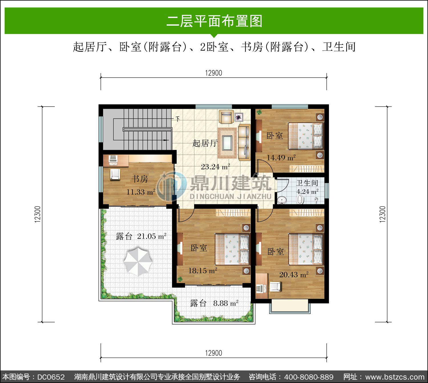 | 二 層: | 起居廳、臥室(附露臺)、2臥室、書房(附露臺)、衛生間 | |||