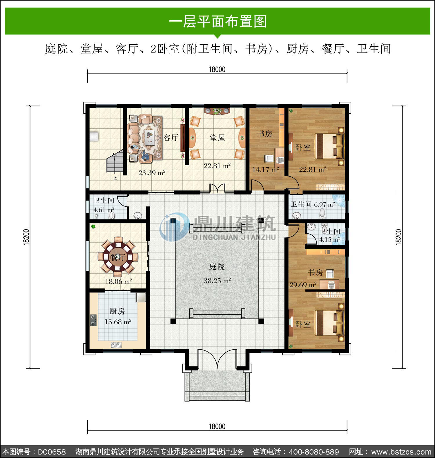 | 一 層: | 庭院、堂屋、客廳、2臥室(附衛生間、書房)、廚房、餐廳、衛生間 | |||