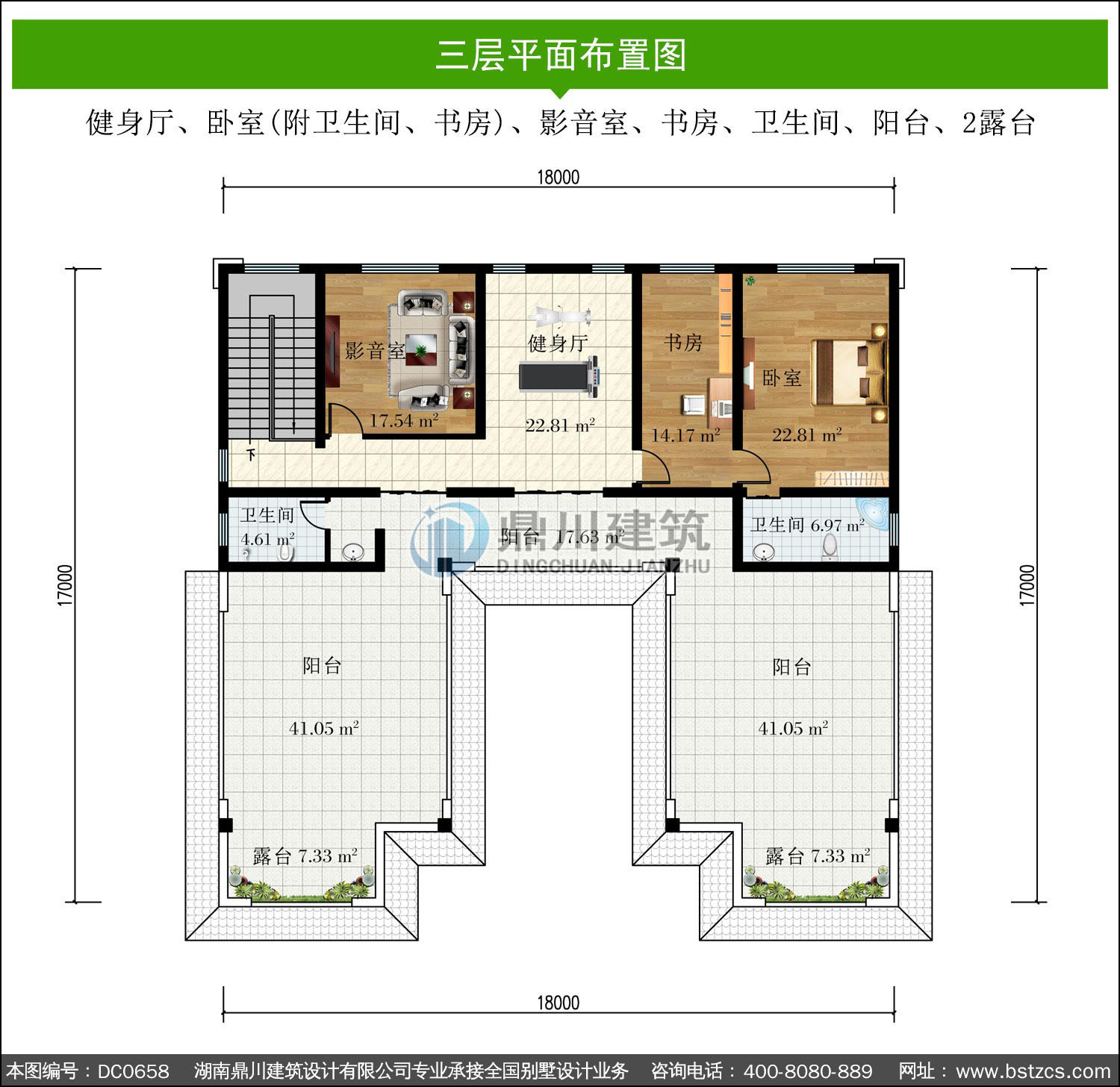 | 三 層: | 健身廳、臥室(附衛生間、書房)、影音室、書房、衛生間、陽臺、2露臺 | |||
