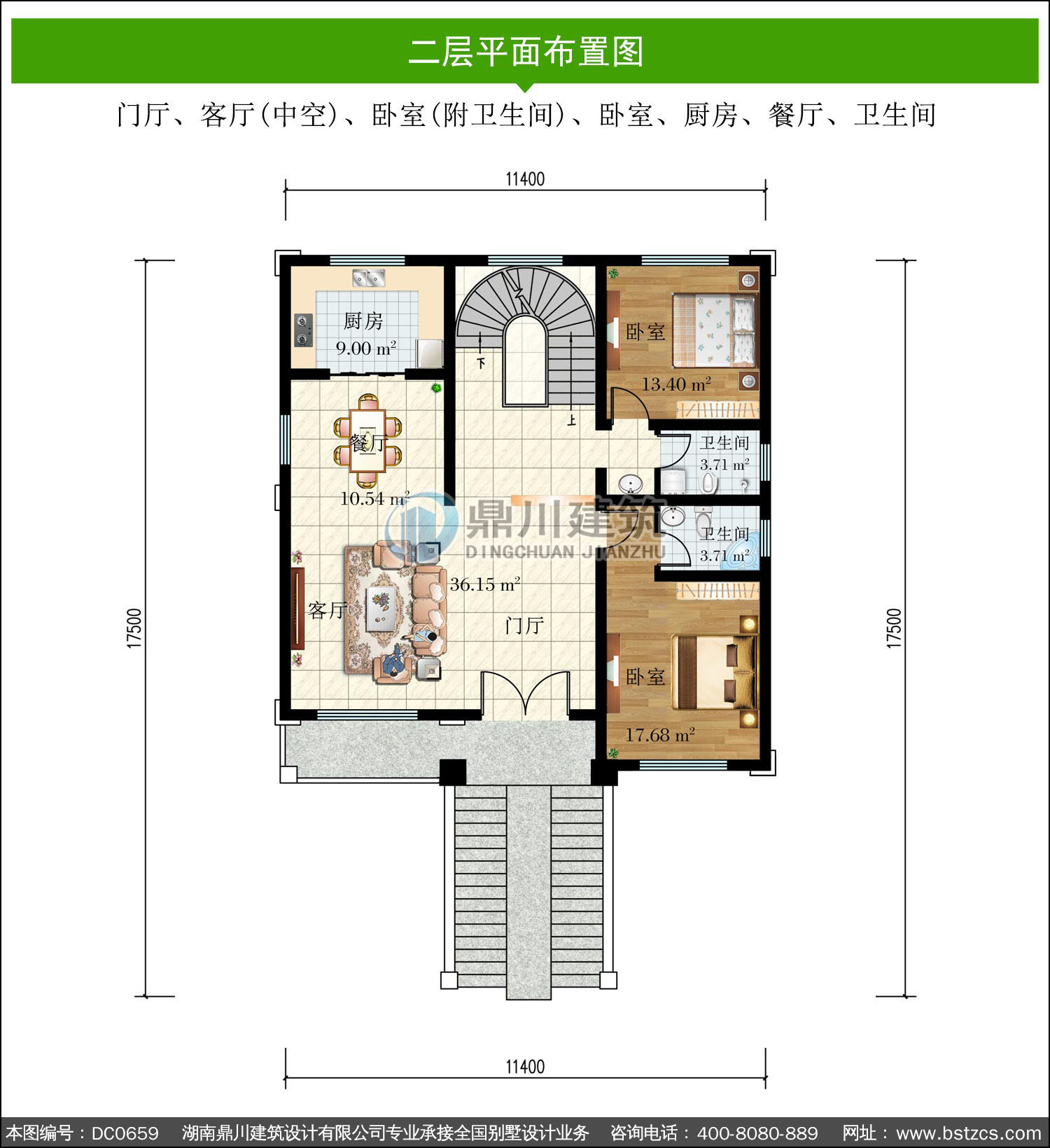| 二 層: | 門廳、客廳(中空)、臥室(附衛生間)、臥室、廚房、餐廳、衛生間 | |||