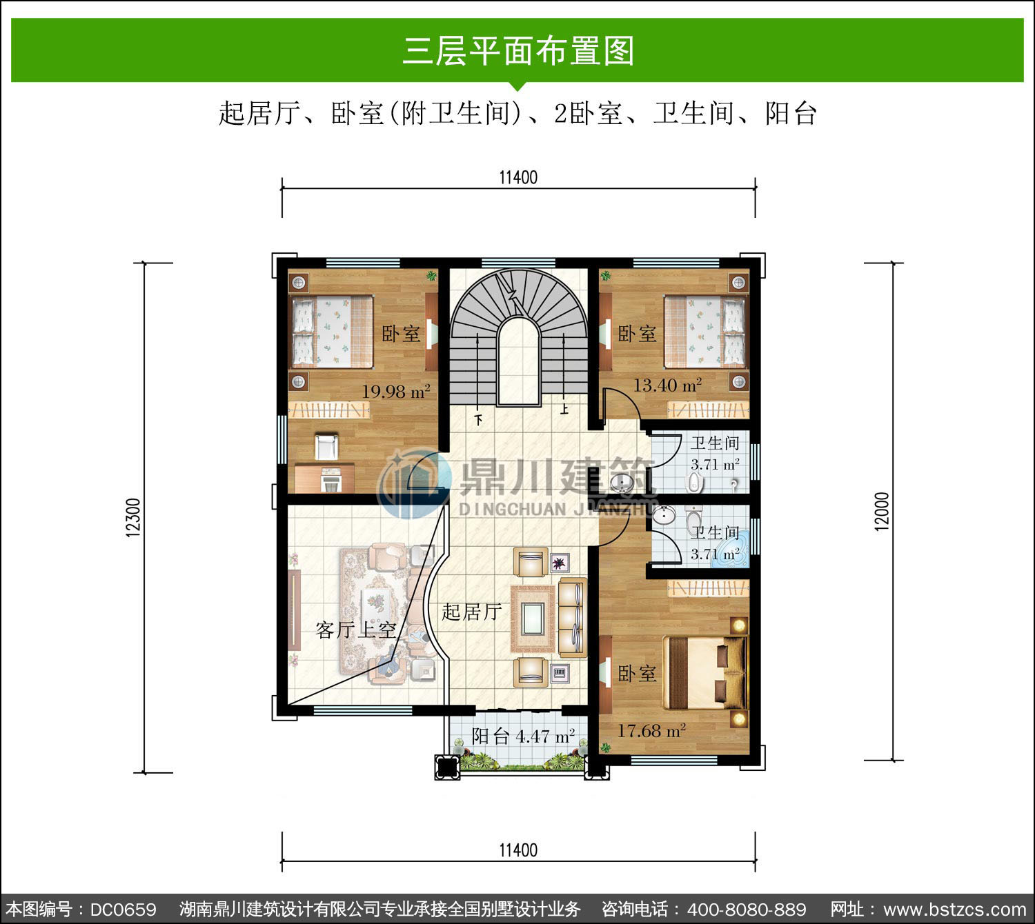 | 三 層: | 起居廳、臥室(附衛生間)、2臥室、衛生間、陽臺 | |||