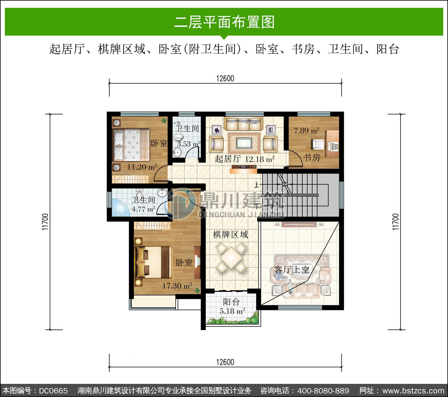 | 二 層: | 起居廳、棋牌區(qū)域、臥室(附衛(wèi)生間)、臥室、書房、衛(wèi)生間、陽臺 | |||