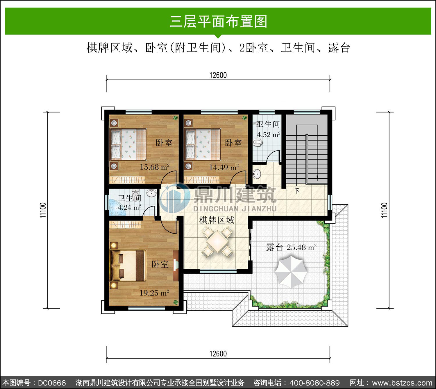 | 三 層: | 棋牌區域、臥室(附衛生間)、2臥室、衛生間、露臺 | |||