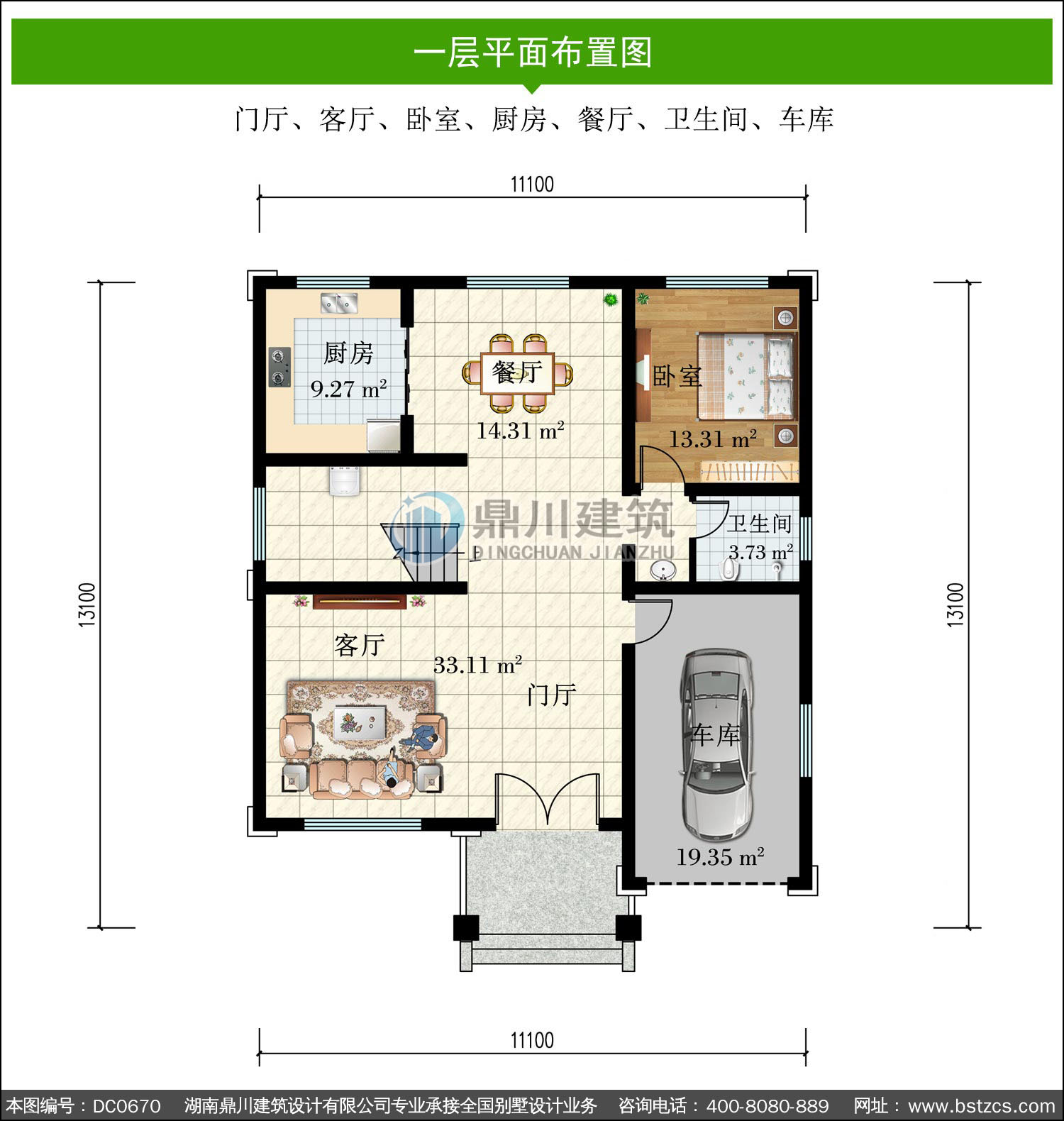 | 一 層: | 門廳、客廳、臥室、廚房、餐廳、衛生間、車庫 | |||