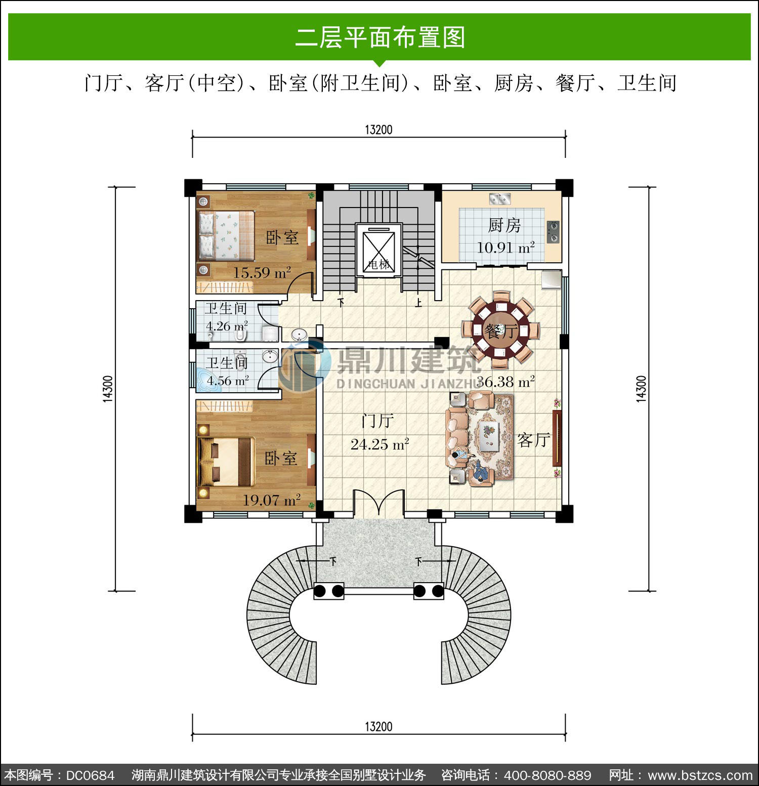 | 二 層: | 門廳、客廳(中空)、臥室(附衛(wèi)生間)、臥室、廚房、餐廳、衛(wèi)生間 | |||