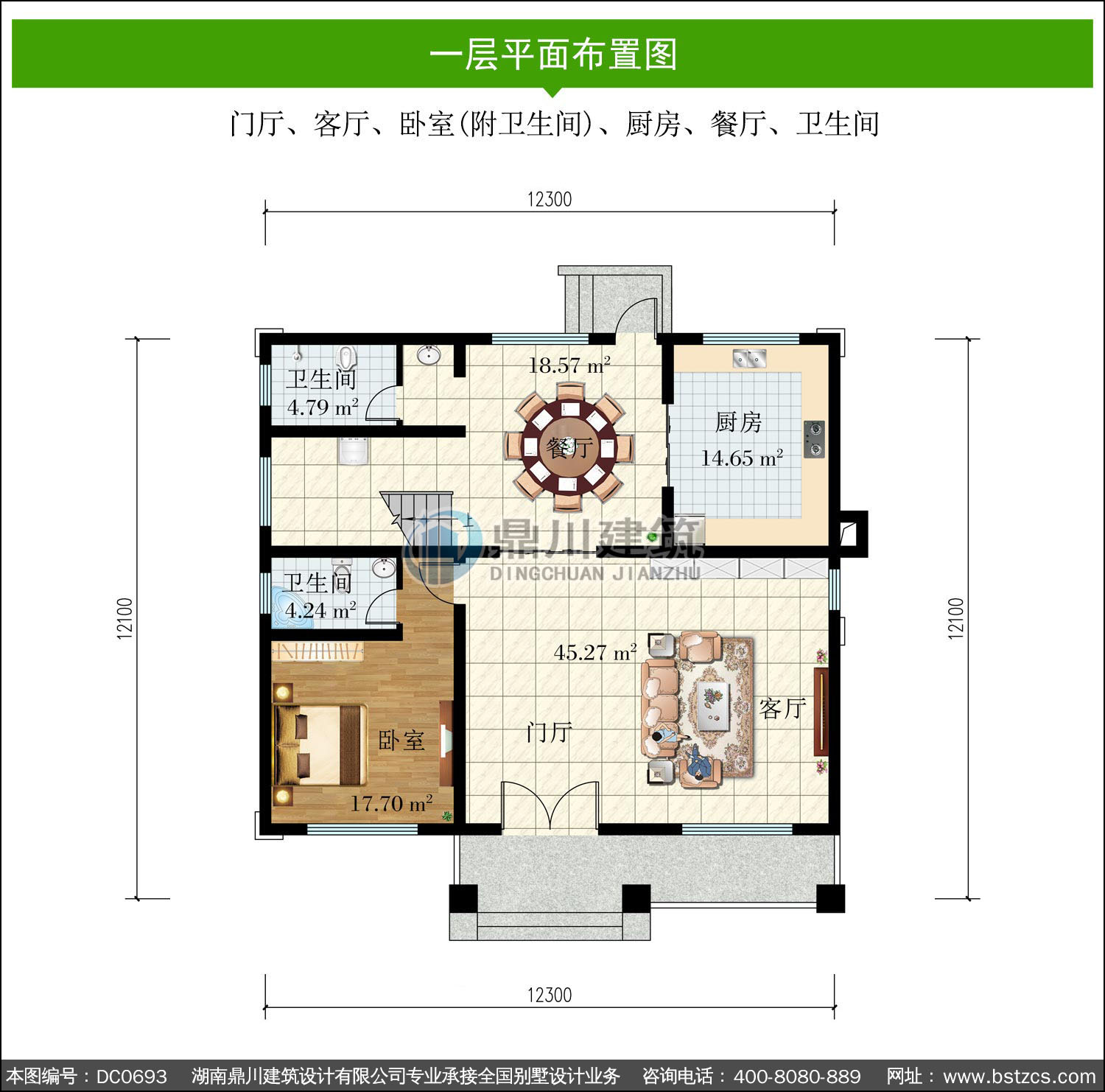 | 一 層: | 門廳、客廳、臥室(附衛生間)、廚房、餐廳、衛生間 | |||