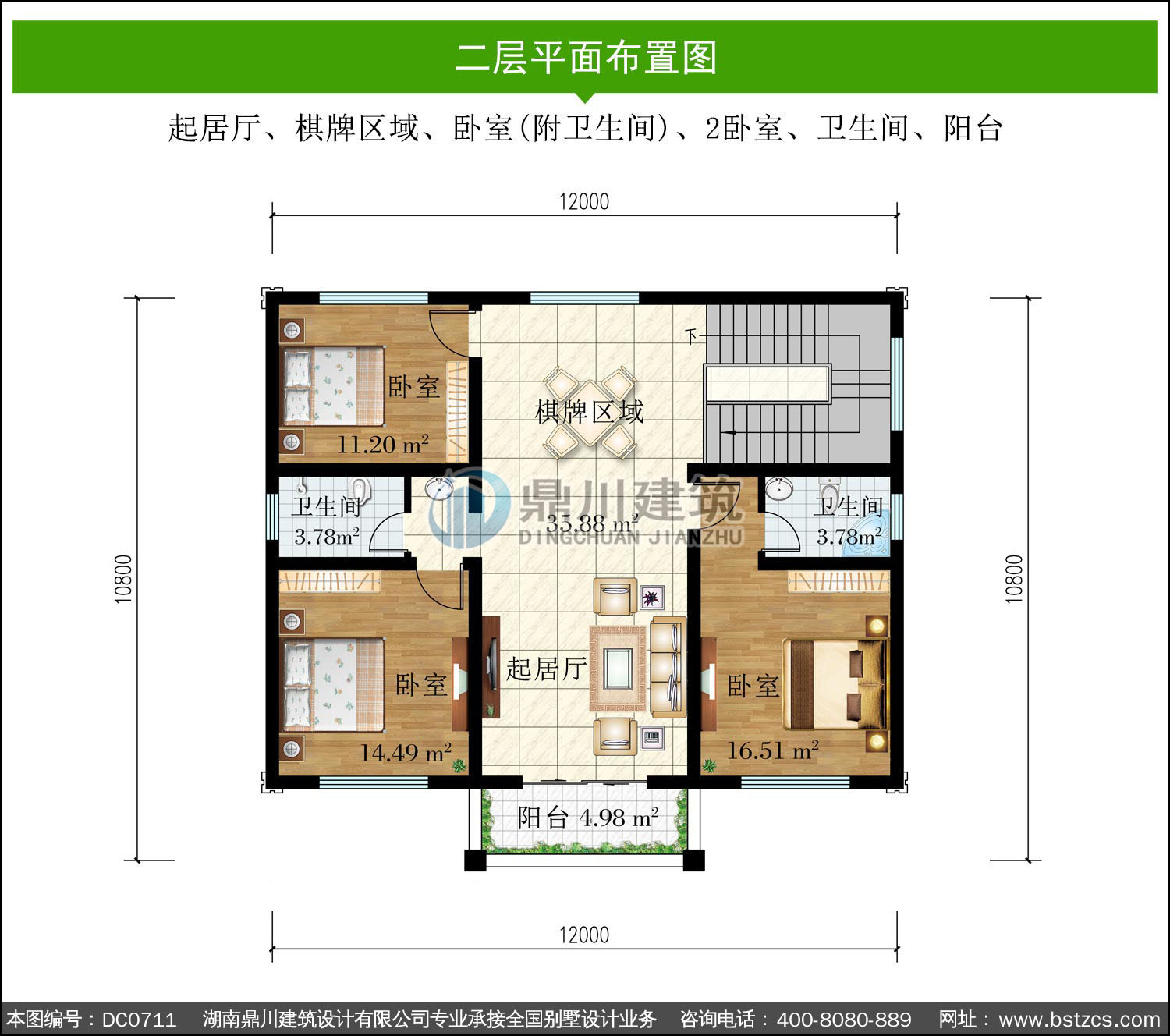 | 二 層: | 起居廳、棋牌區域、臥室(附衛生間)、2臥室、衛生間、陽臺 | |||