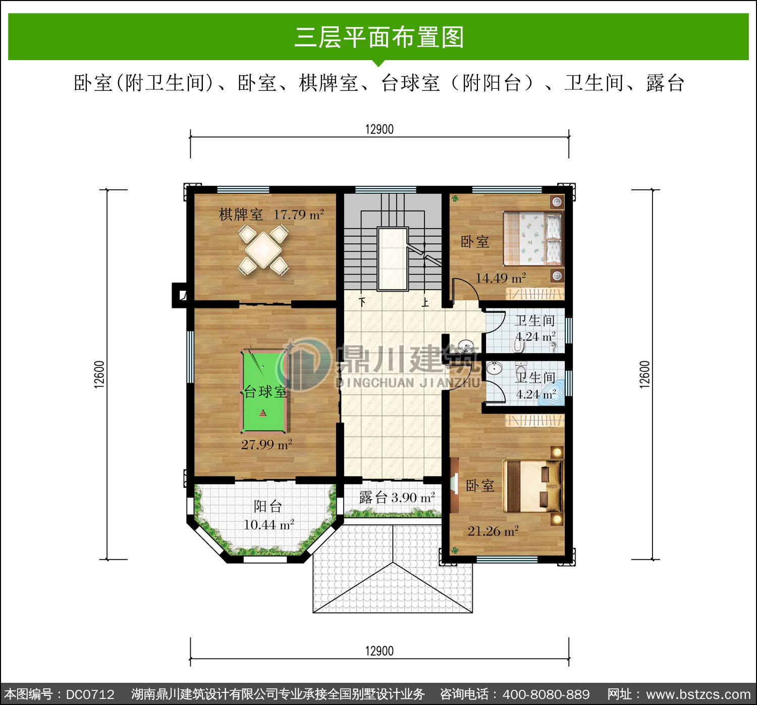 | 三 層: | 臥室(附衛生間)、臥室、棋牌室、臺球室(附陽臺)、衛生間、露臺 | |||