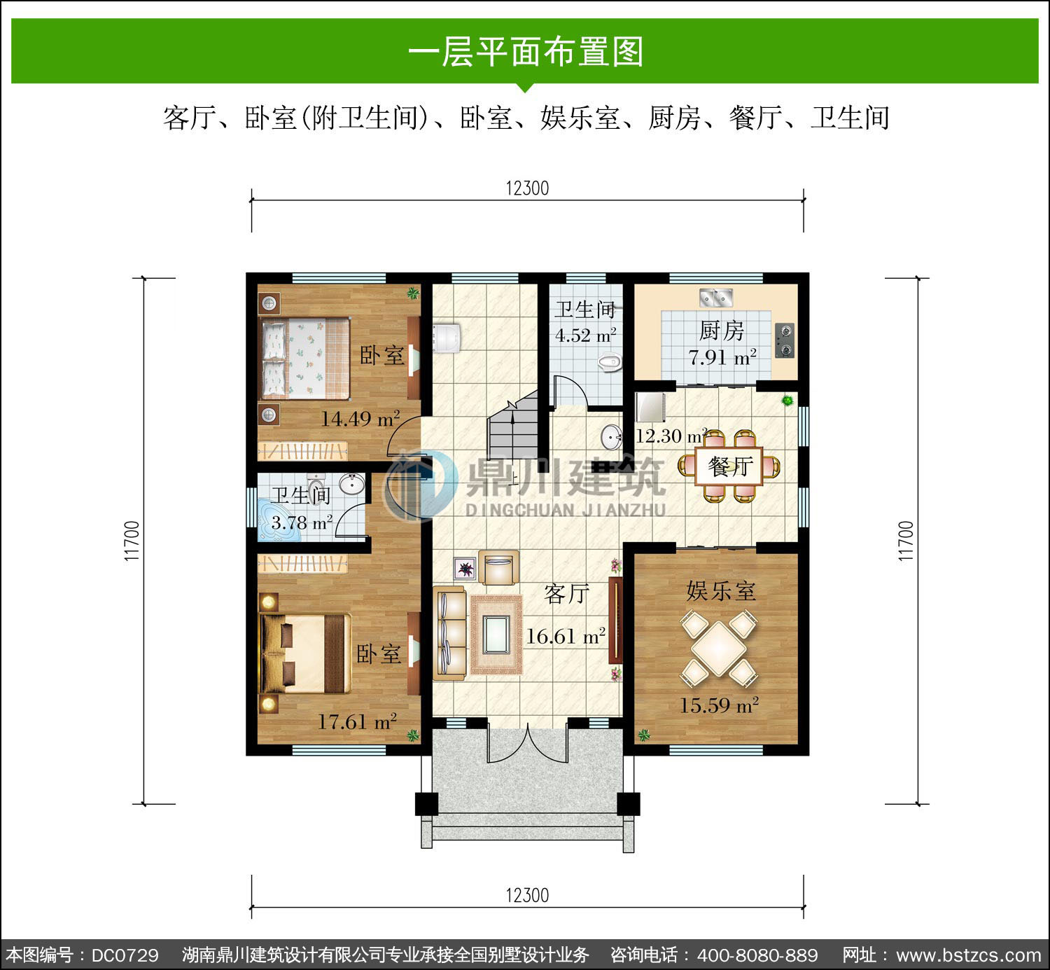 | 一 層: | 客廳、臥室(附衛生間)、臥室、娛樂室、廚房、餐廳、衛生間 | |||