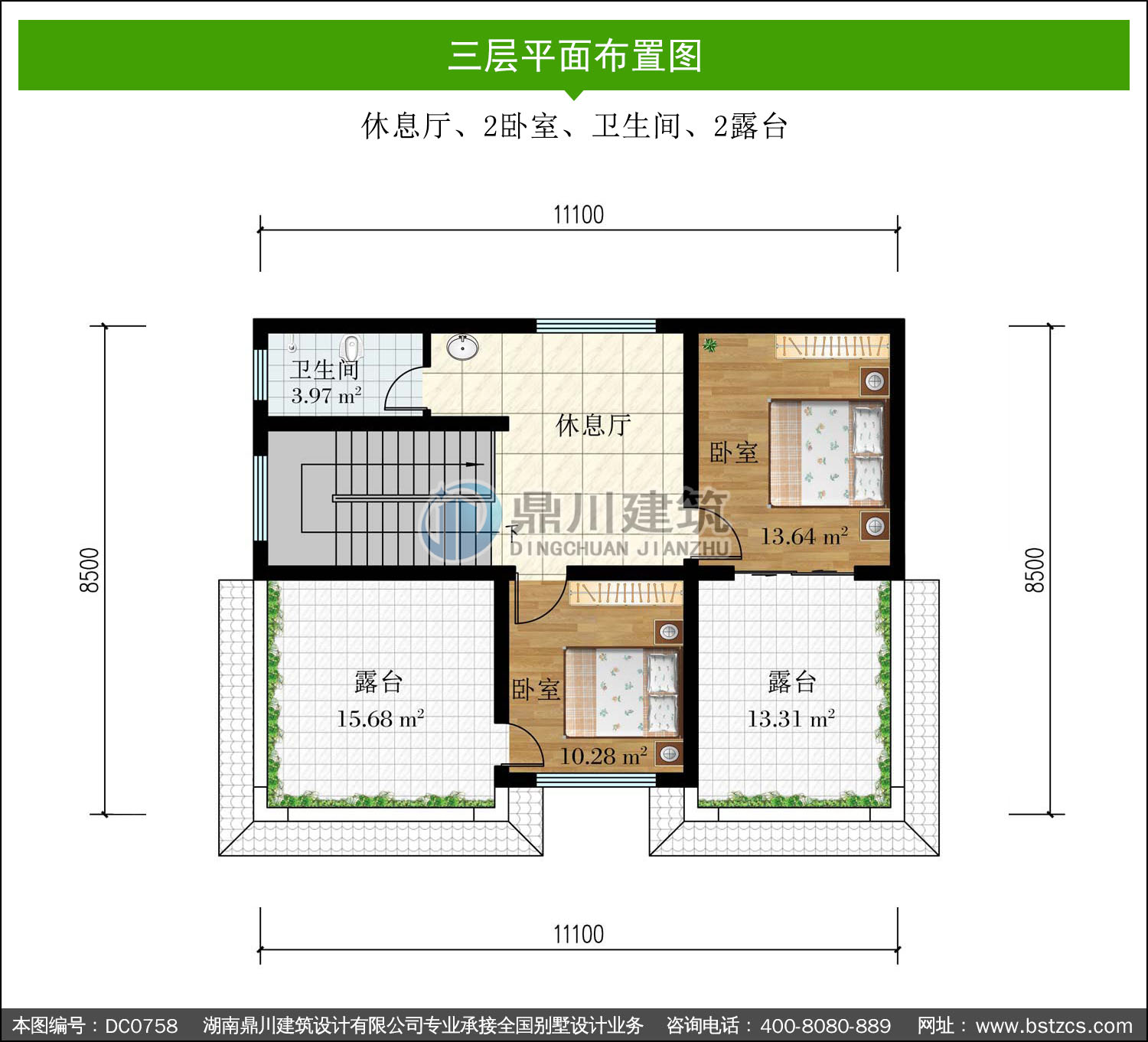 | 二 層: | 休息廳、棋牌區(qū)域、臥室(附衛(wèi)生間)、2臥室、衛(wèi)生間、露臺 | |||