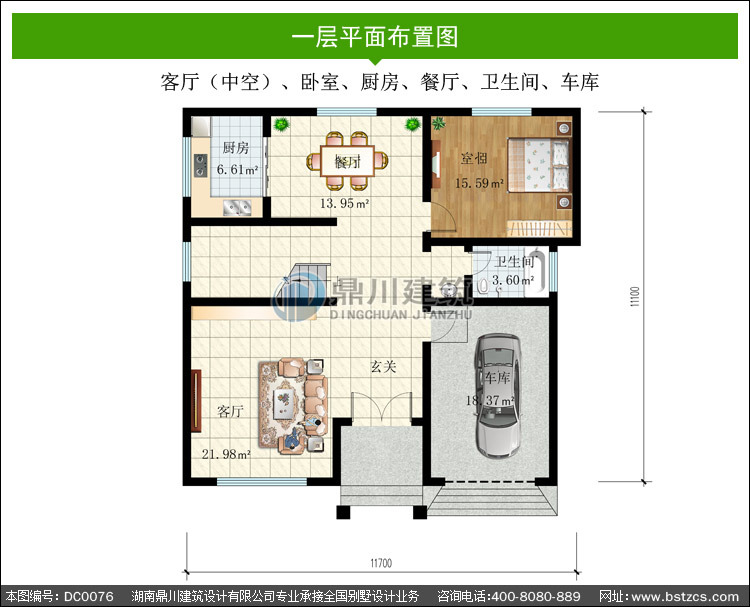 | 一 層: | 客廳(中空)、臥室、廚房、餐廳、衛生間、車庫 | |||