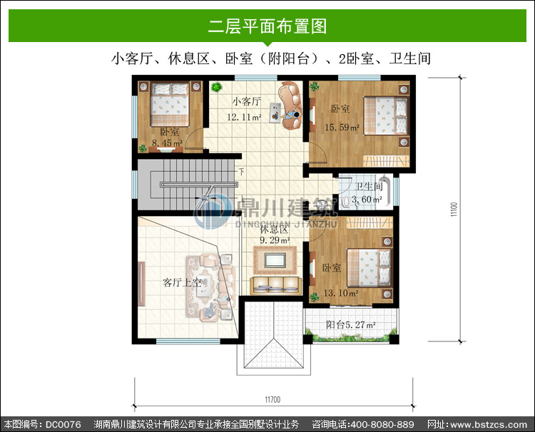 | 二 層: | 小客廳、休息區、臥室(附陽臺)、2臥室、衛生間 | |||