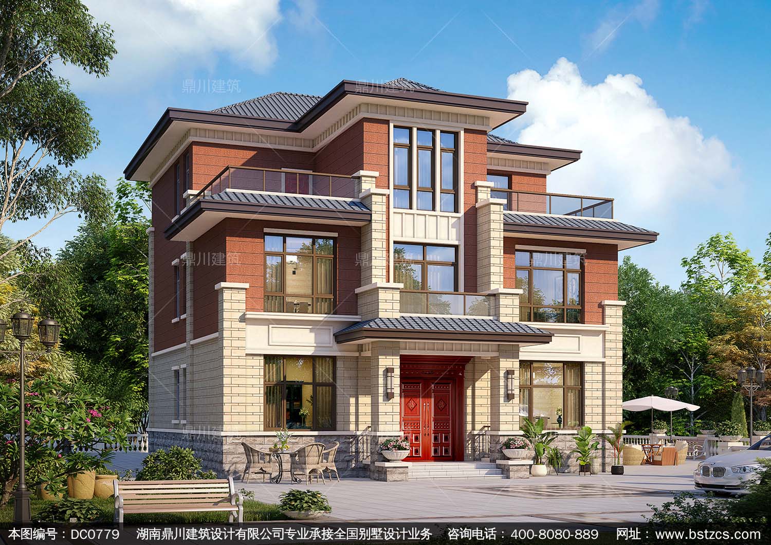 新中式三層帶露臺別墅圖紙效果圖_農村自建別墅設計,鼎川建筑