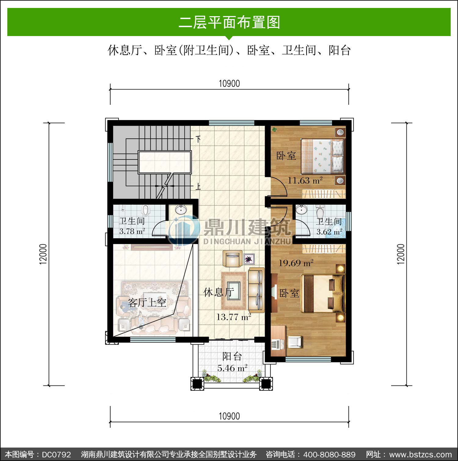 | 二 層: | 休息廳、臥室(附衛生間)、臥室、衛生間、陽臺 | |||