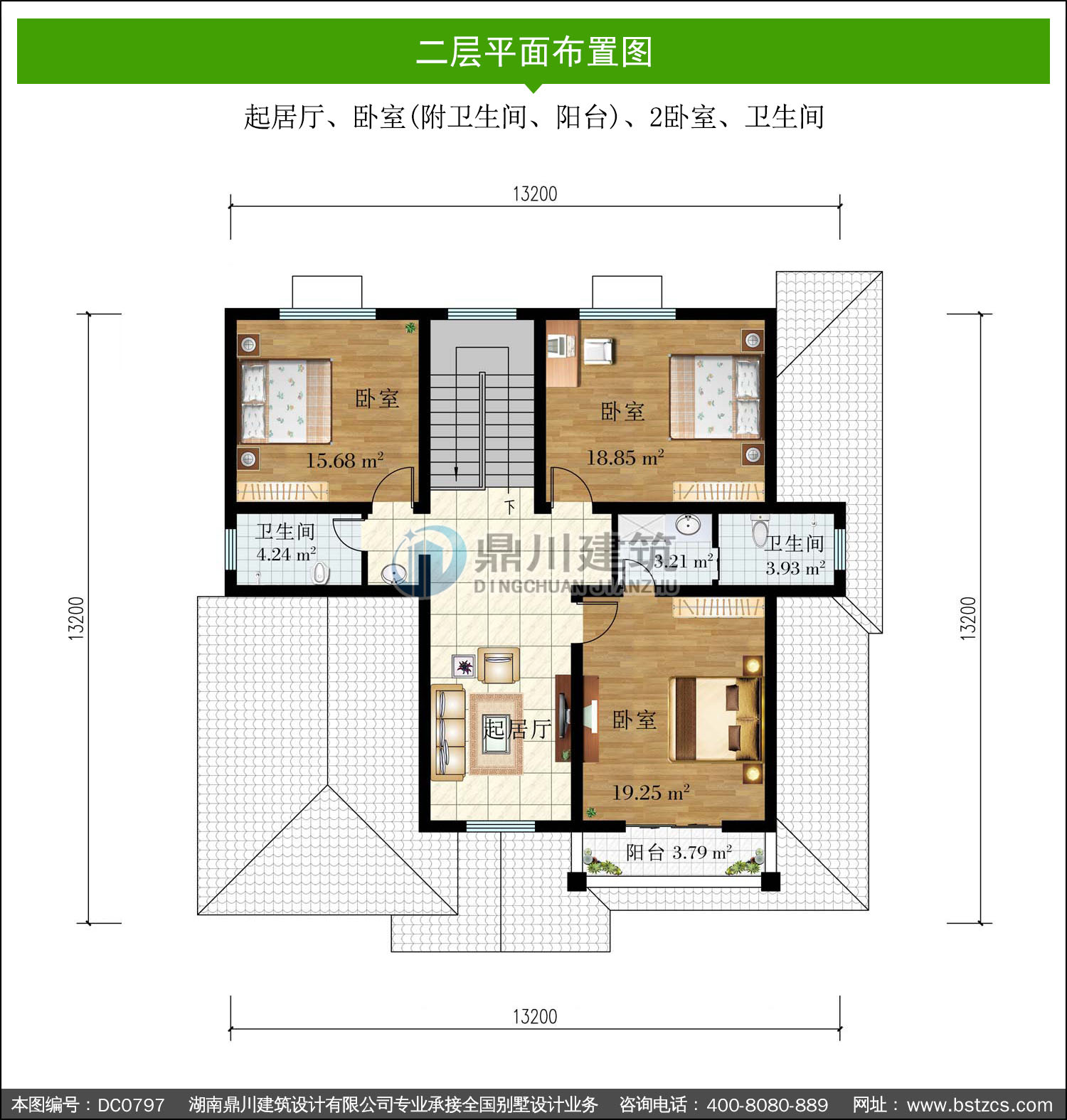 | 二 層: | 起居廳、臥室(附衛生間、陽臺)、2臥室、衛生間 | |||