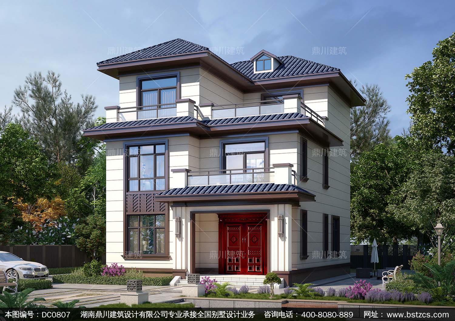 新中式三層帶露臺別墅圖紙效果圖_農村自建別墅設計,鼎川建筑