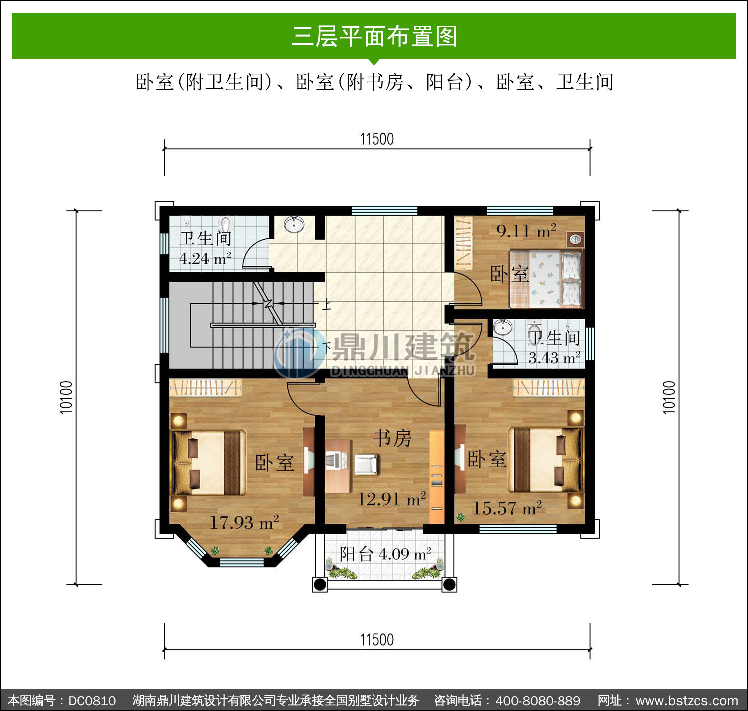 | 三 層: | 臥室(附衛生間)、臥室(附書房、陽臺)、臥室、衛生間 | |||