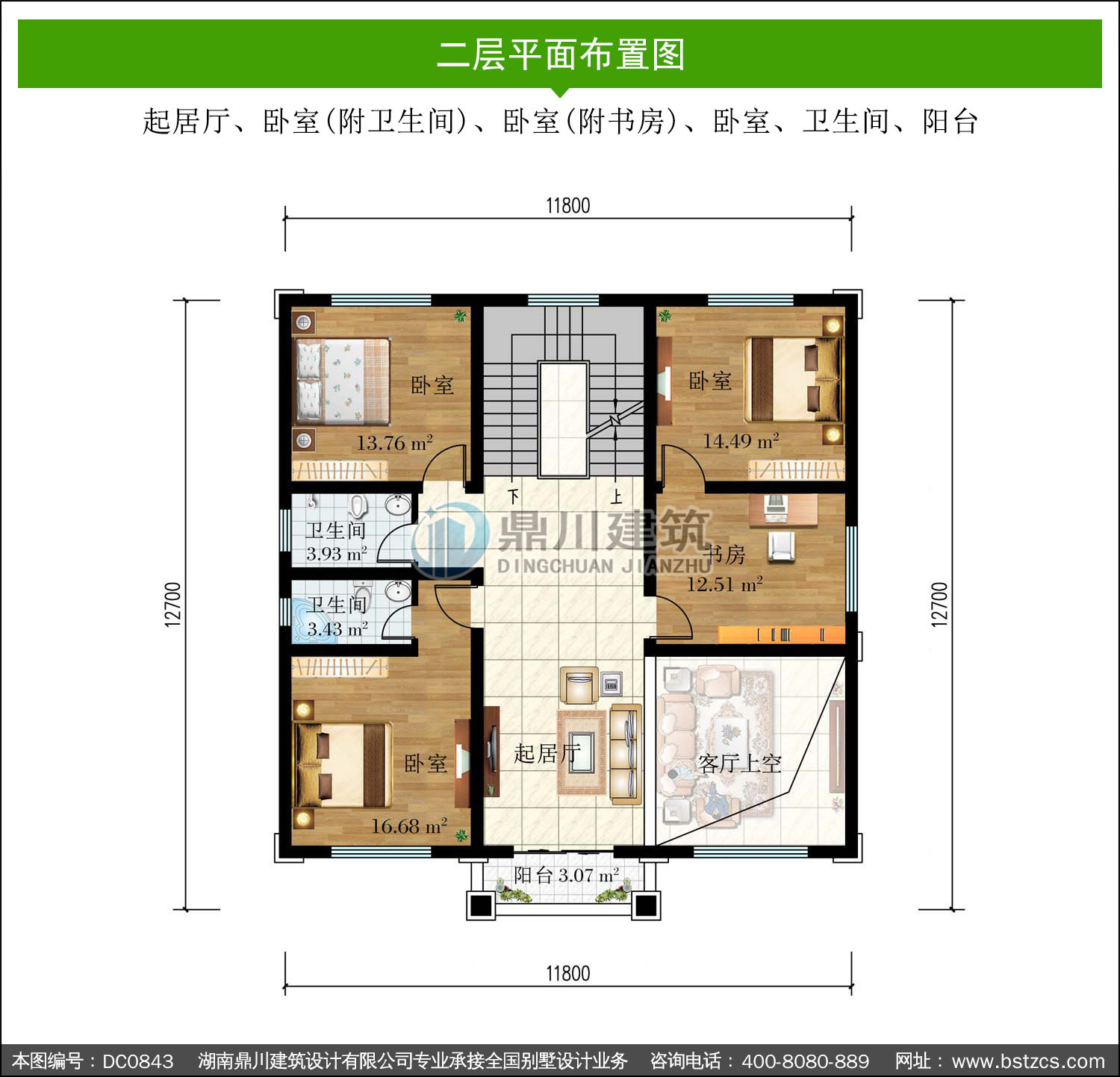 | 二 層: | 起居廳、臥室(附衛生間)、臥室(附書房)、臥室、衛生間、陽臺 | |||