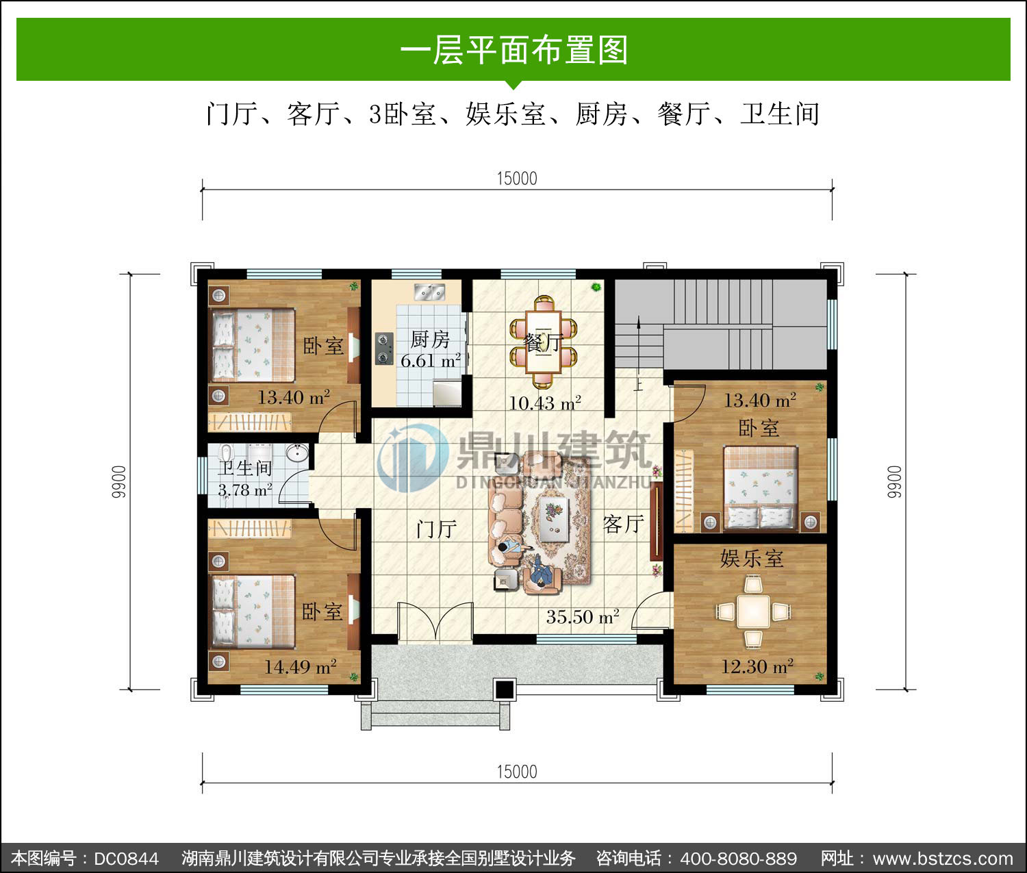 | 一 層: | 門廳、客廳、3臥室、娛樂室、廚房、餐廳、衛生間 | |||