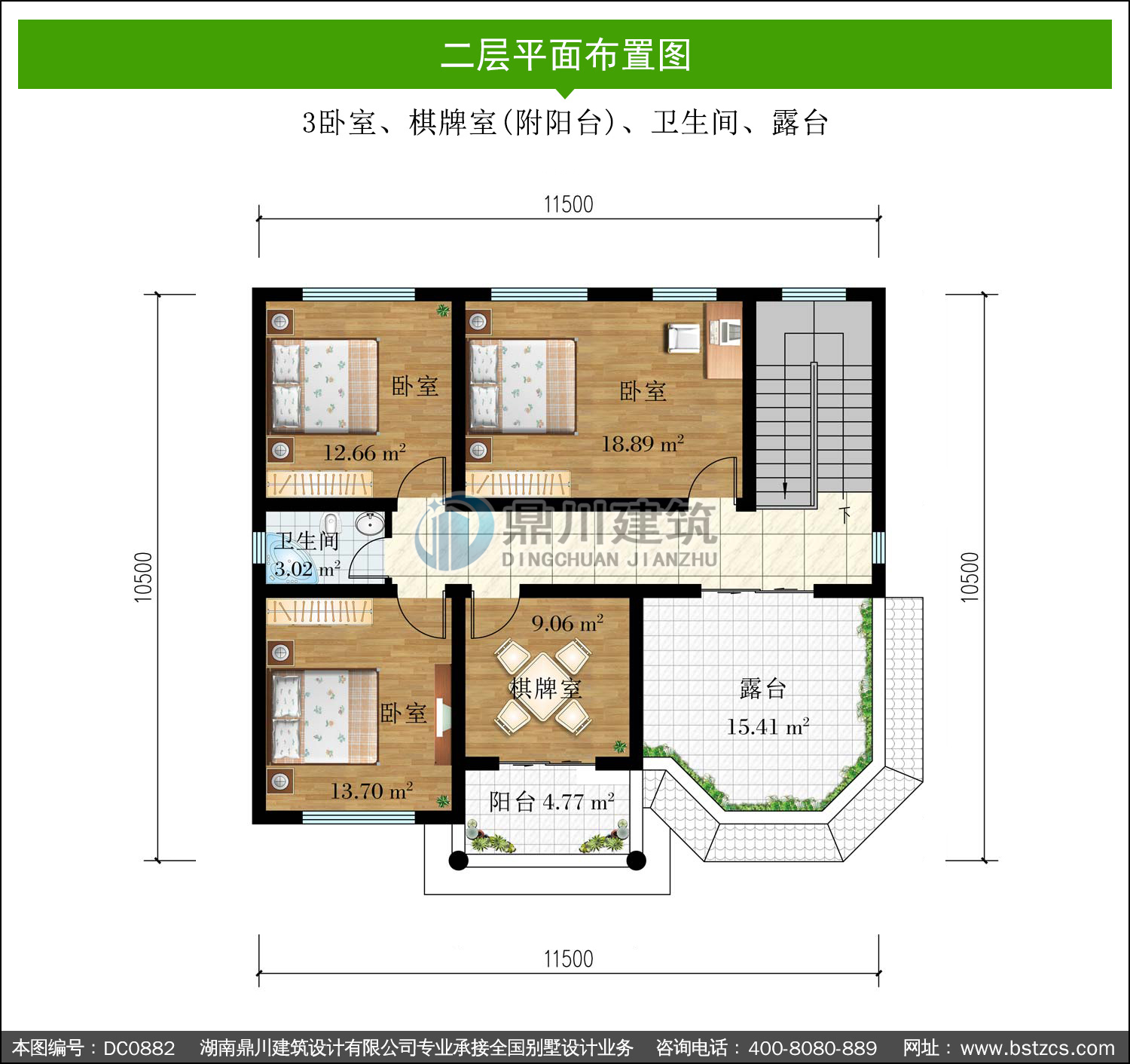 | 二 層: | 3臥室、棋牌室(附陽臺)、衛生間、露臺 | |||