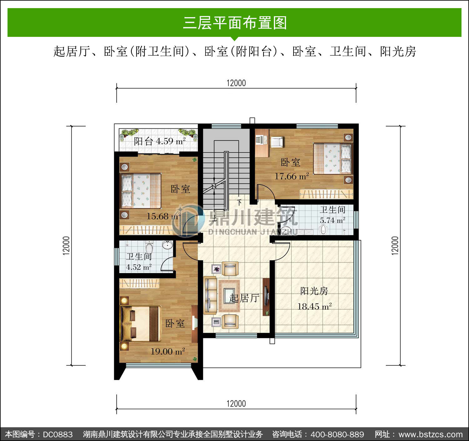 | 三 層: | 起居廳、臥室(附衛生間)、臥室(附陽臺)、臥室、衛生間、陽光房 | |||