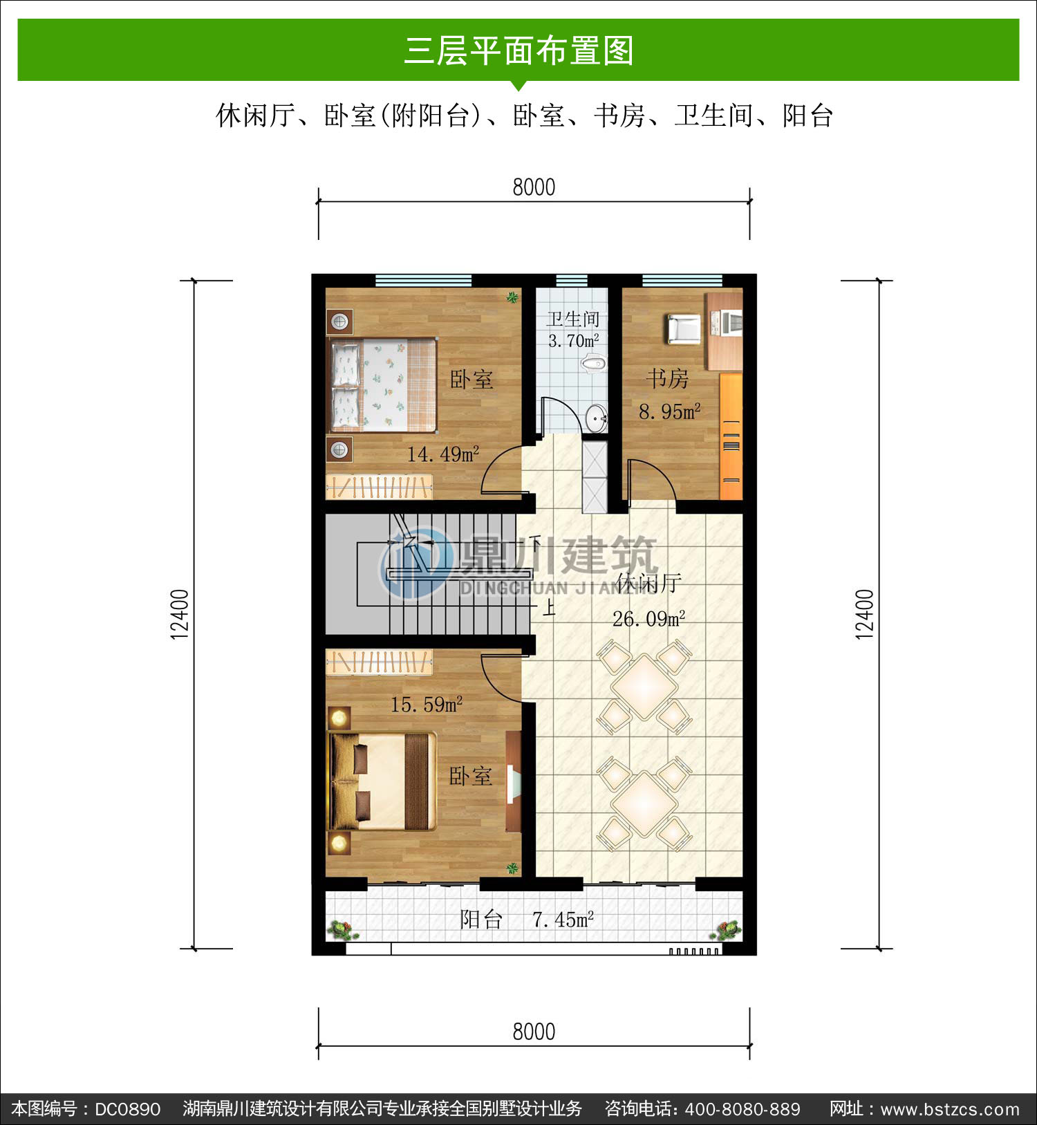 | 三 層: | 休閑廳、臥室(附陽臺)、臥室、書房、衛(wèi)生間、陽臺 | |||