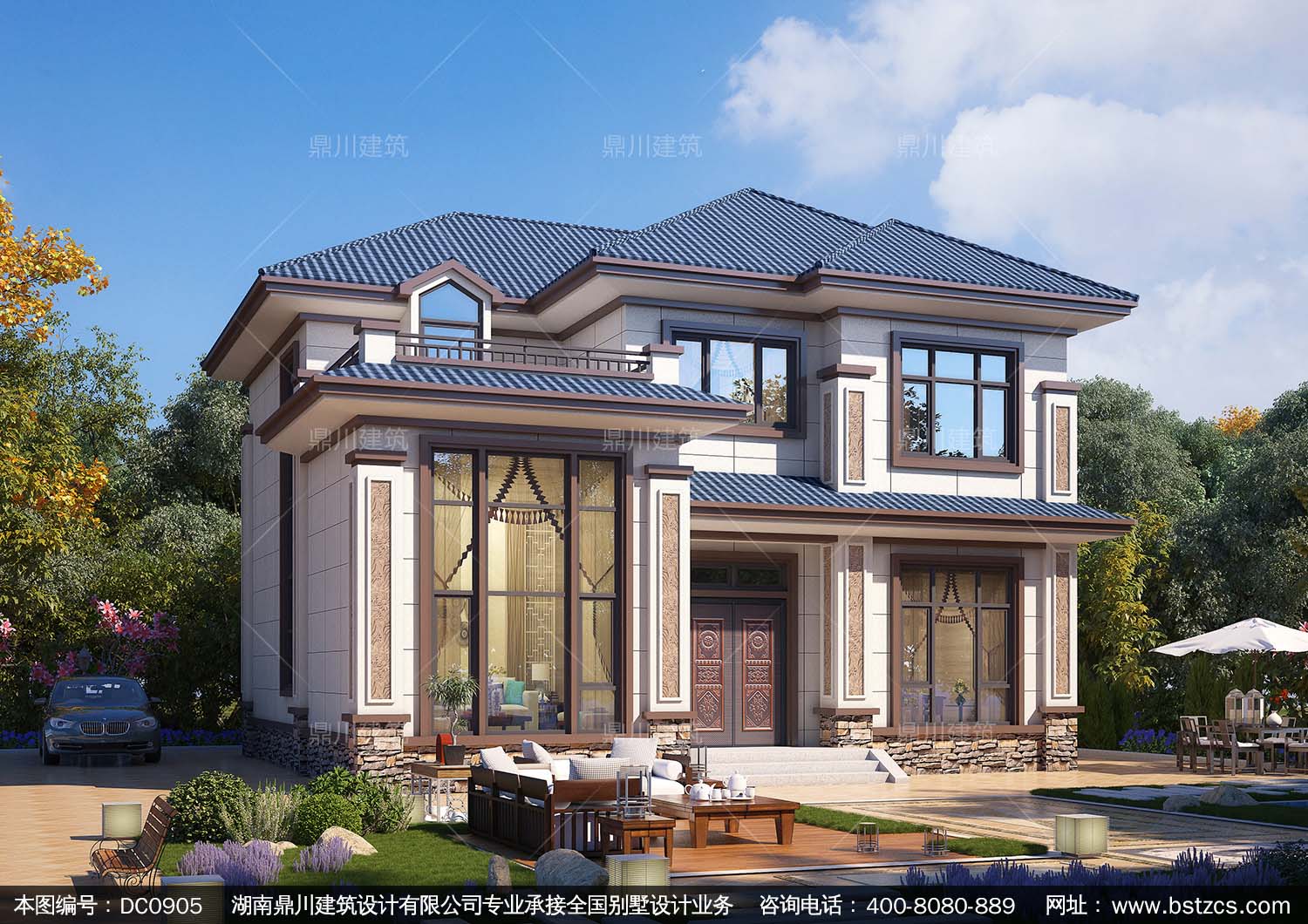 新中式二層帶露臺別墅效果圖及施工圖紙_農(nóng)村自建房設計,鼎川建筑