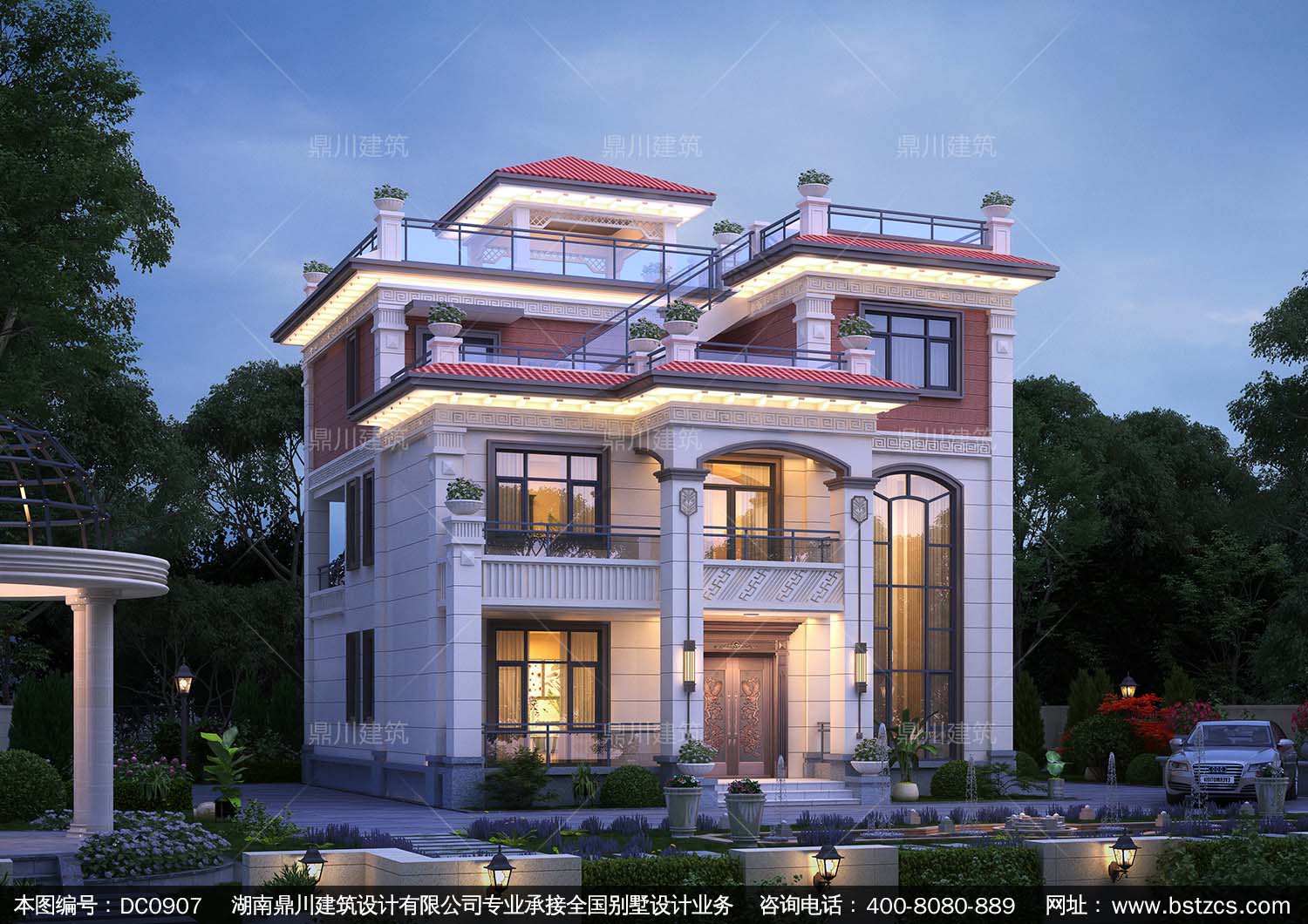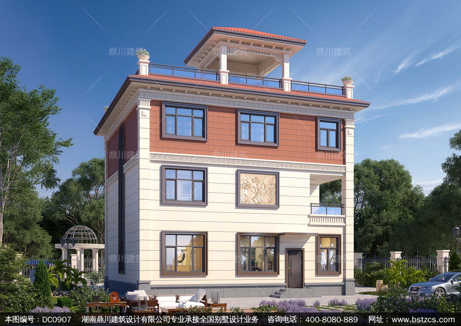 復式三層帶涼亭別墅效果圖及施工圖紙_新農村自建別墅設計,鼎川建筑