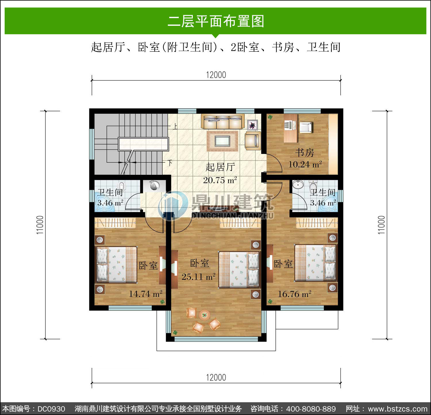 | 二 層: | 起居廳、臥室(附衛生間)、2臥室、書房、衛生間 | |||