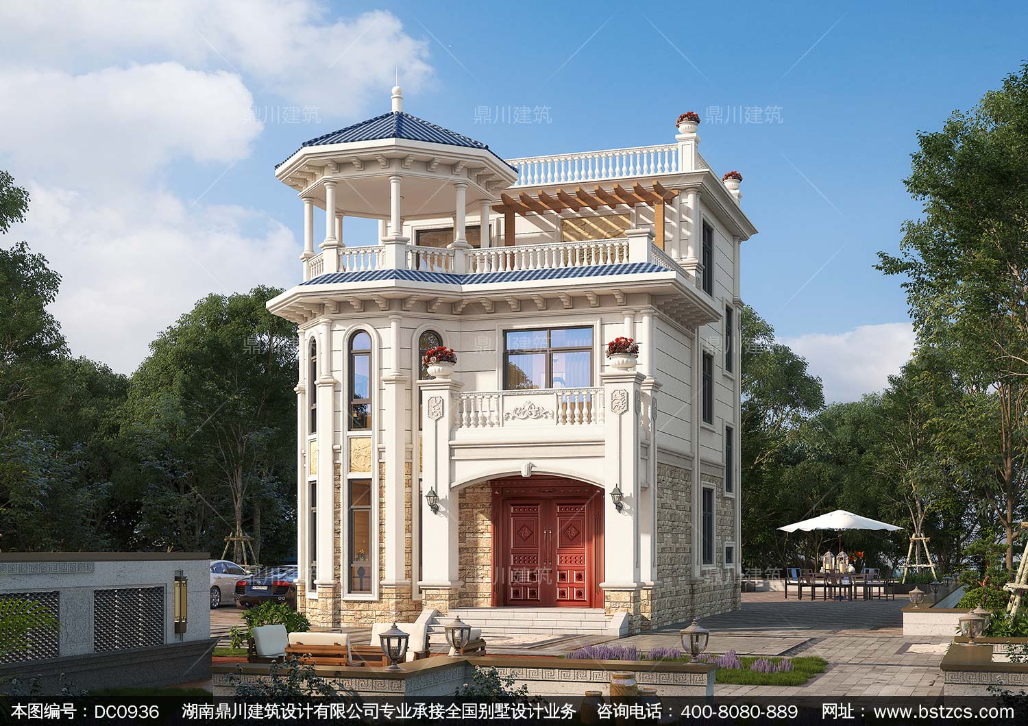 歐式三層帶涼亭實(shí)用小別墅效果圖及施工圖紙_新農(nóng)村自建房設(shè)計(jì),鼎川建筑