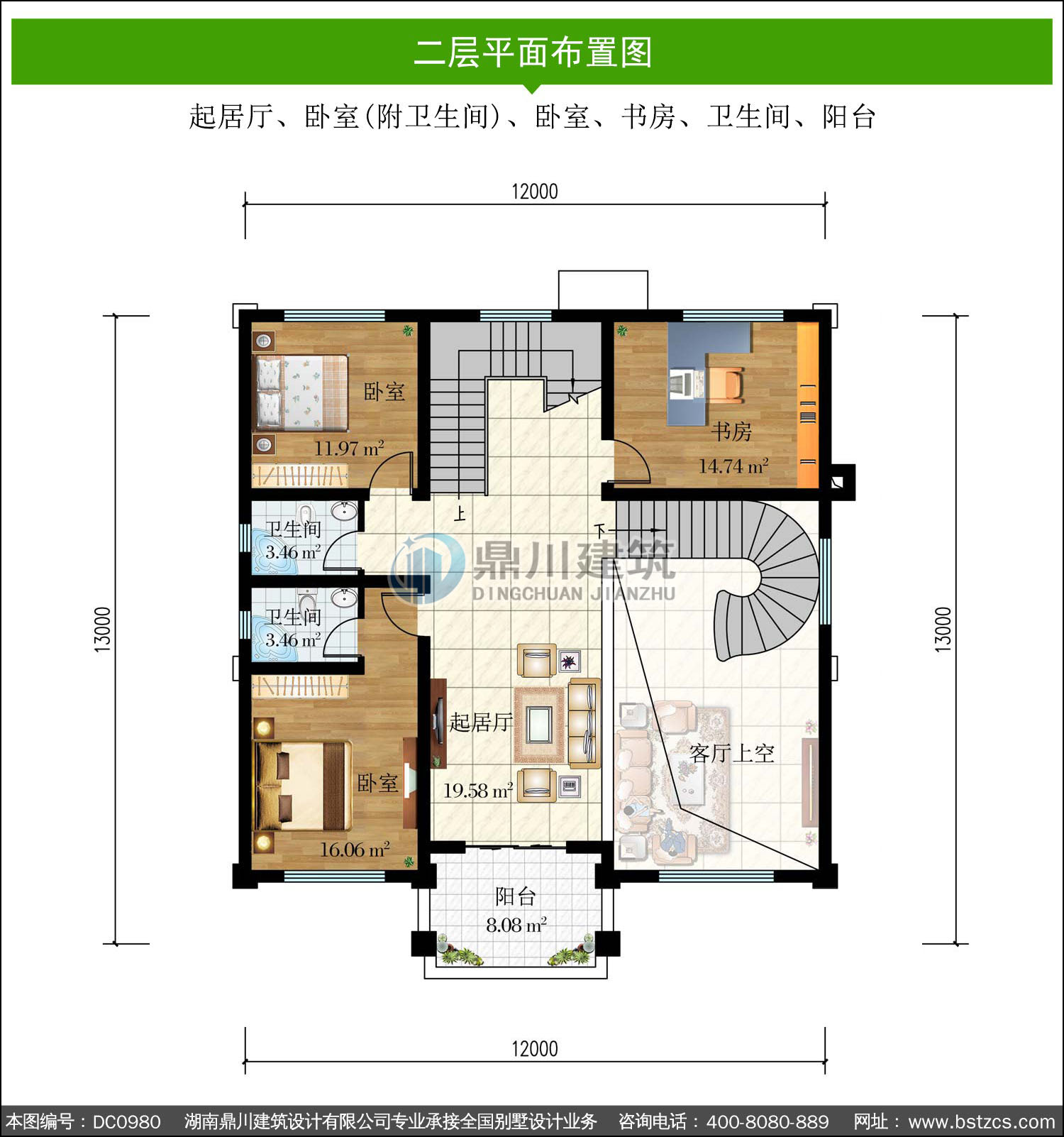 | 二 層: | 起居廳、臥室(附衛生間)、臥室、書房、衛生間、陽臺 | |||