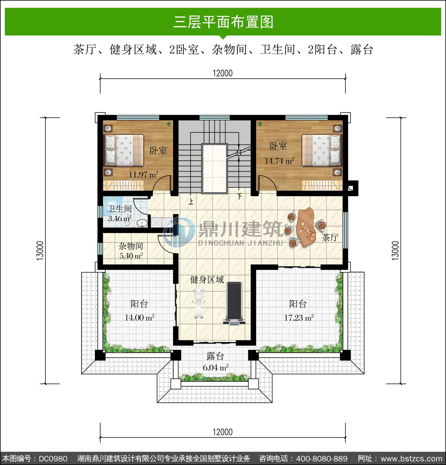| 三 層: | 茶廳、健身區域、2臥室、雜物間、衛生間、2陽臺、露臺 | |||